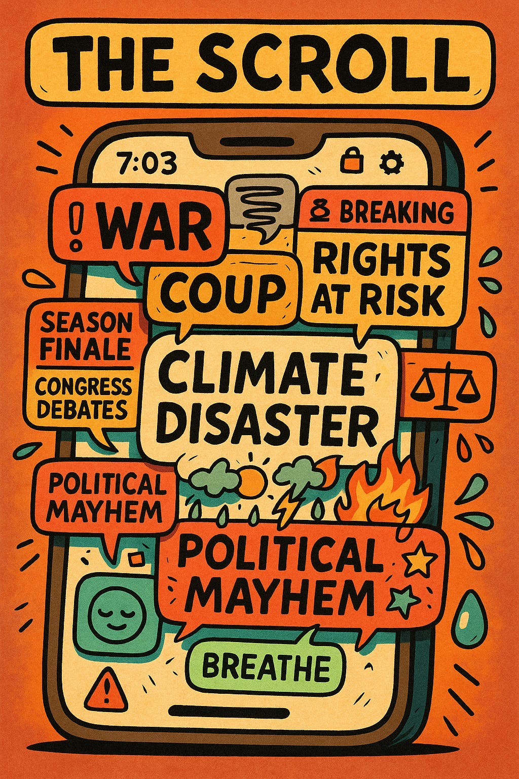 Every scroll is emotional whiplash: a genocide update, a makeup tutorial, an engagement announcement, and a meme about anxiety, all within three swipes.